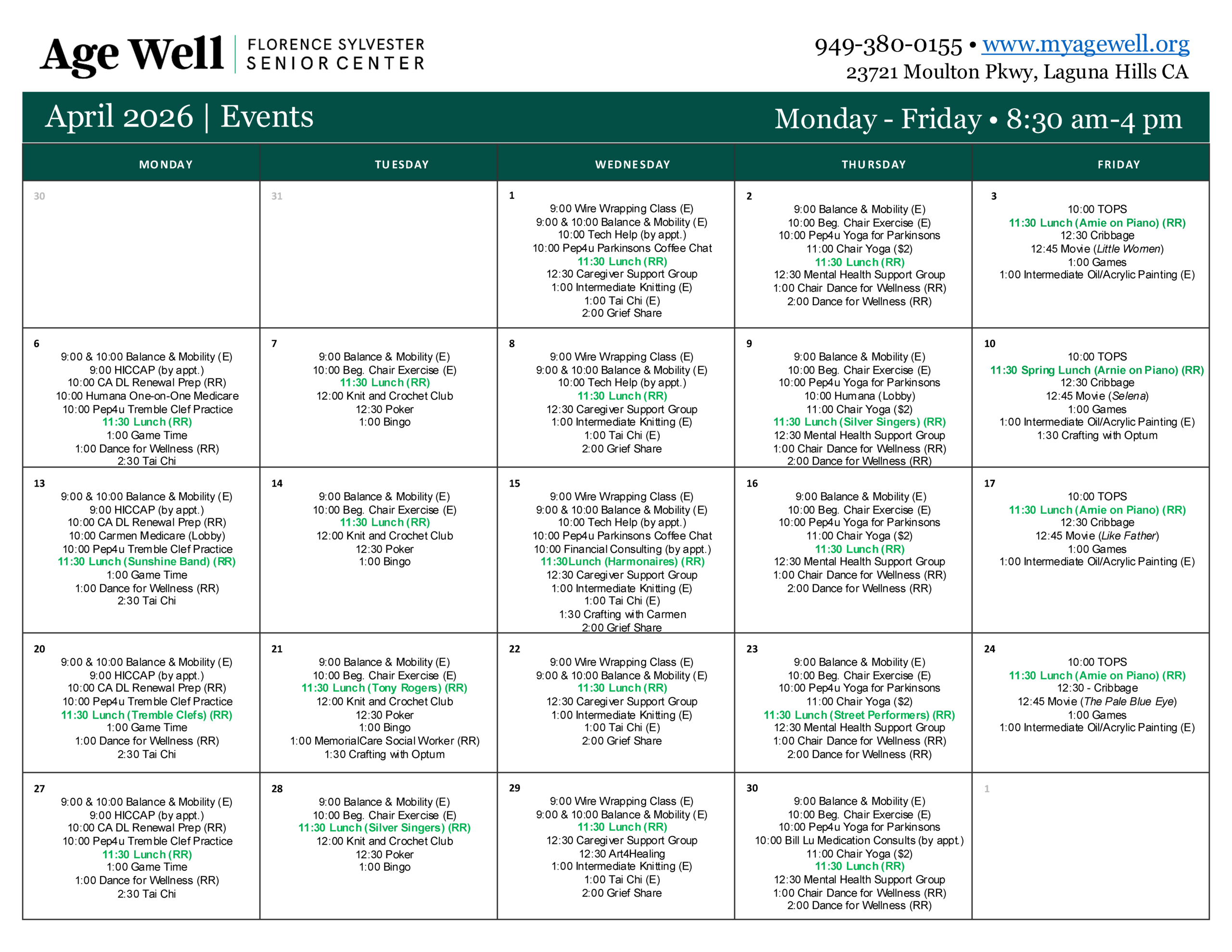 Every contribution designated to Age Well’s Florence Sylvester Senior Center stays in the Laguna Hills community. Your support helps provide daily lunches, wellness programs, activities, and vital services for older adults in South Orange County. When you give here, you are directly supporting seniors where they live.