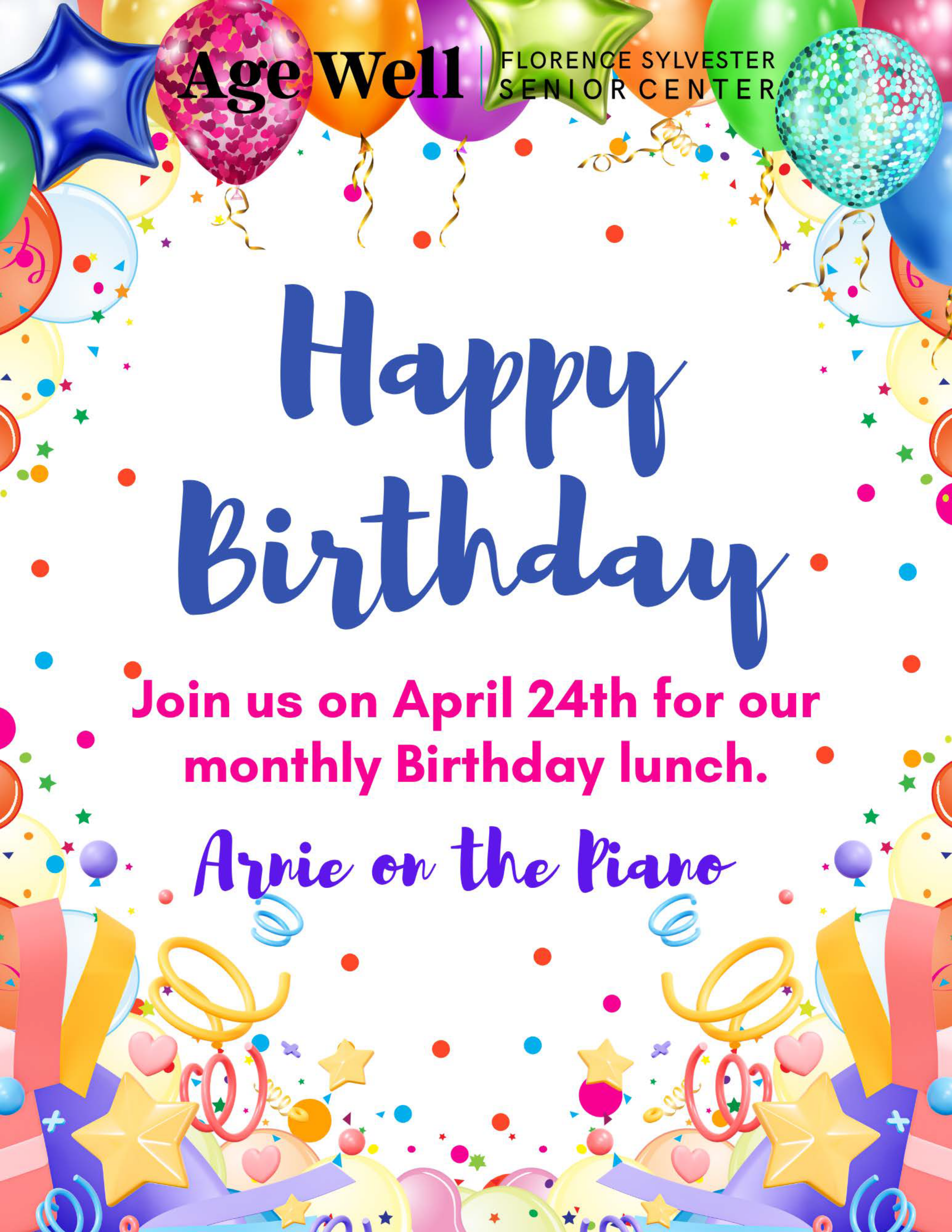 Celebrate monthly birthdays with food, fun, and entertainment in a festive group lunch. Last Friday of each month from 11:30 AM–12:30 PM.