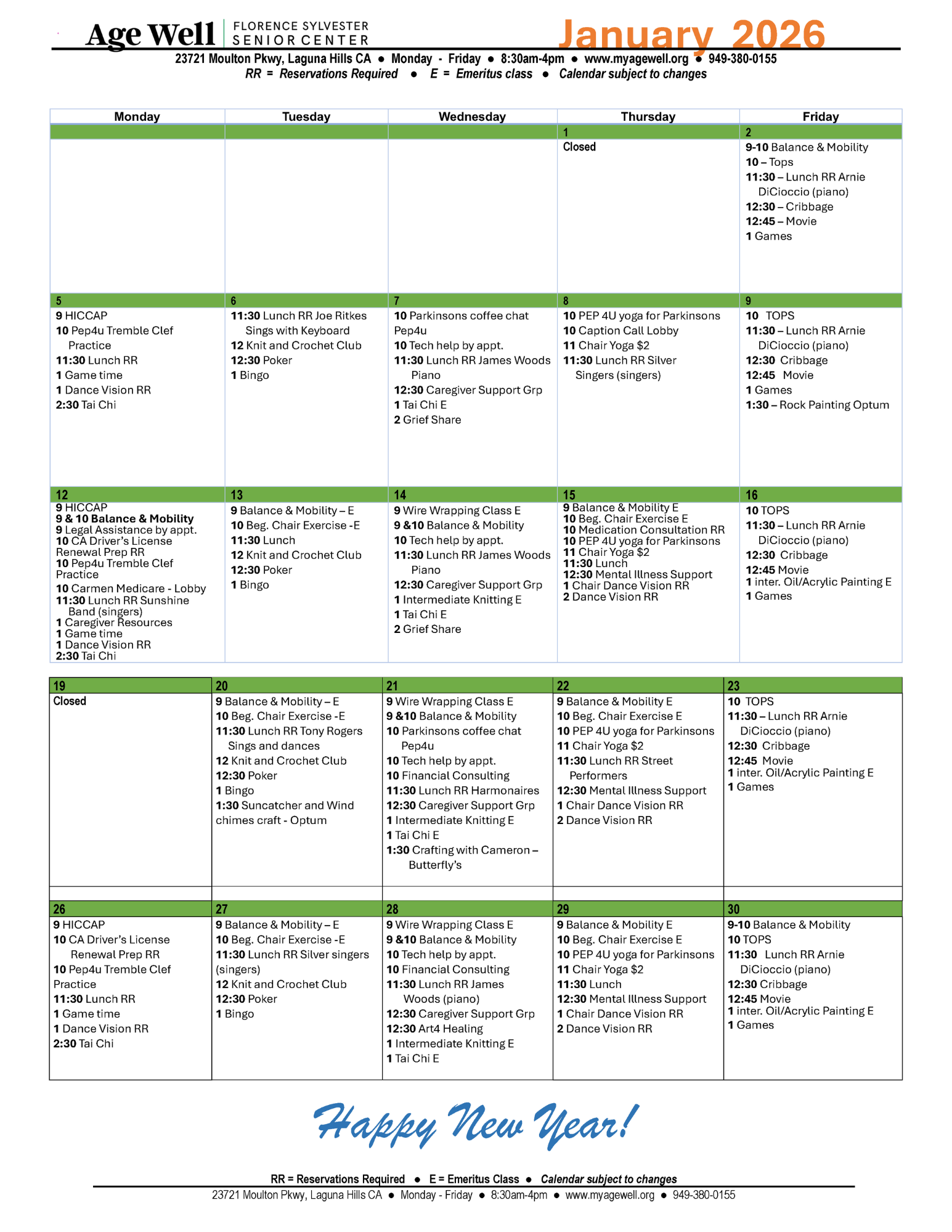- Special Events & Notes: New Year’s closure (Jan 1 and Jan 19), Parkinson’s Coffee Chat, CaptionCall support, Emeritus classes offered