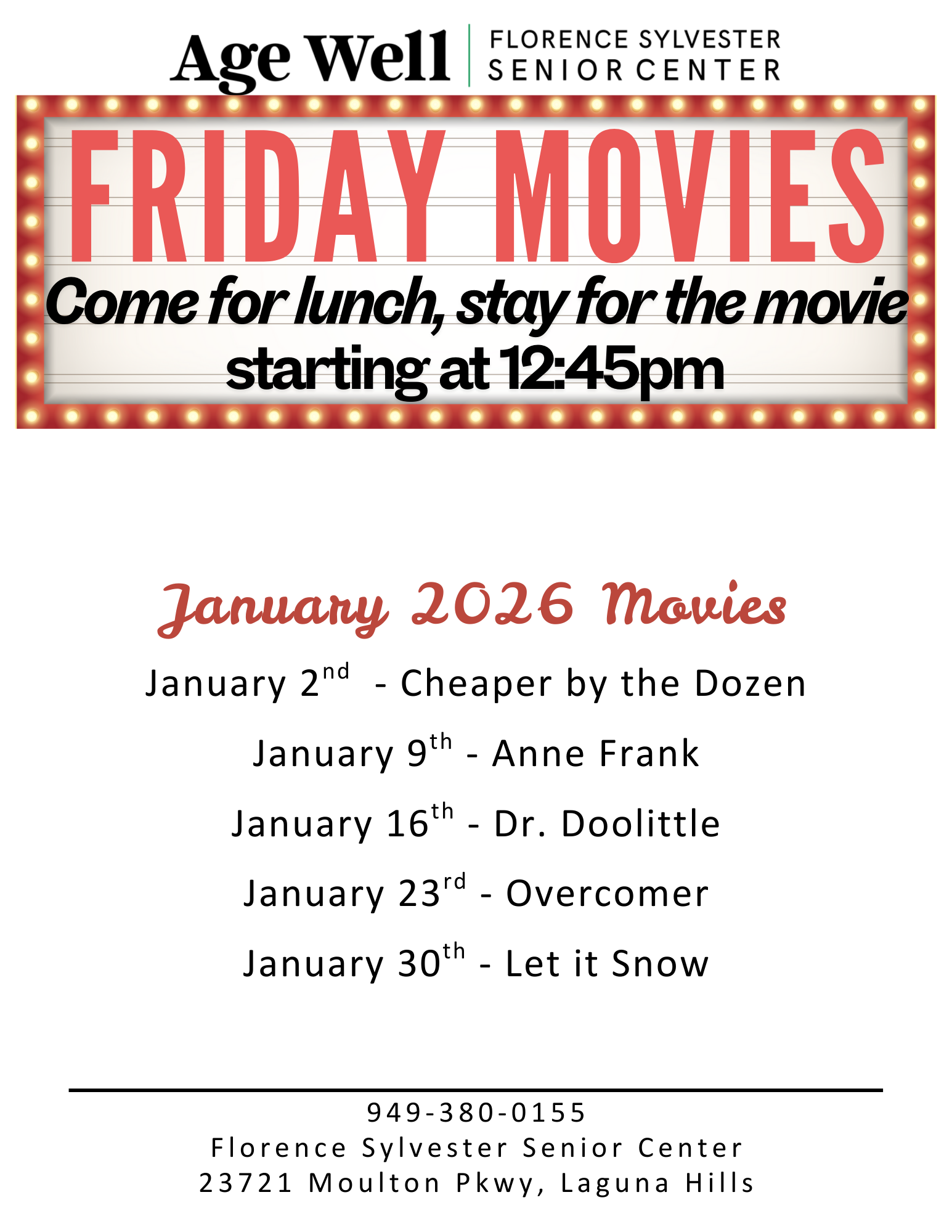 Join us for Friday movies at Age Well’s Florence Sylvester Senior Center. Come for lunch and stay for the movie. Screenings take place Fridays in January, with the movie starting at 12:45 PM.
