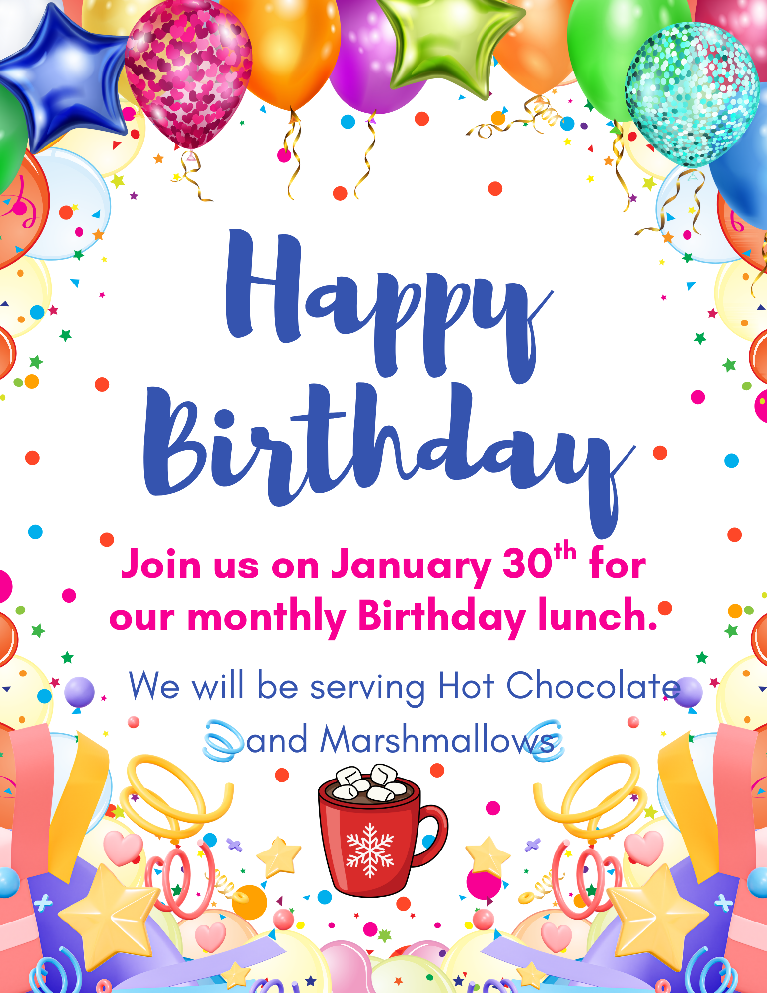 Celebrate January birthdays with friends. Join us for our monthly birthday lunch featuring hot chocolate and marshmallows.