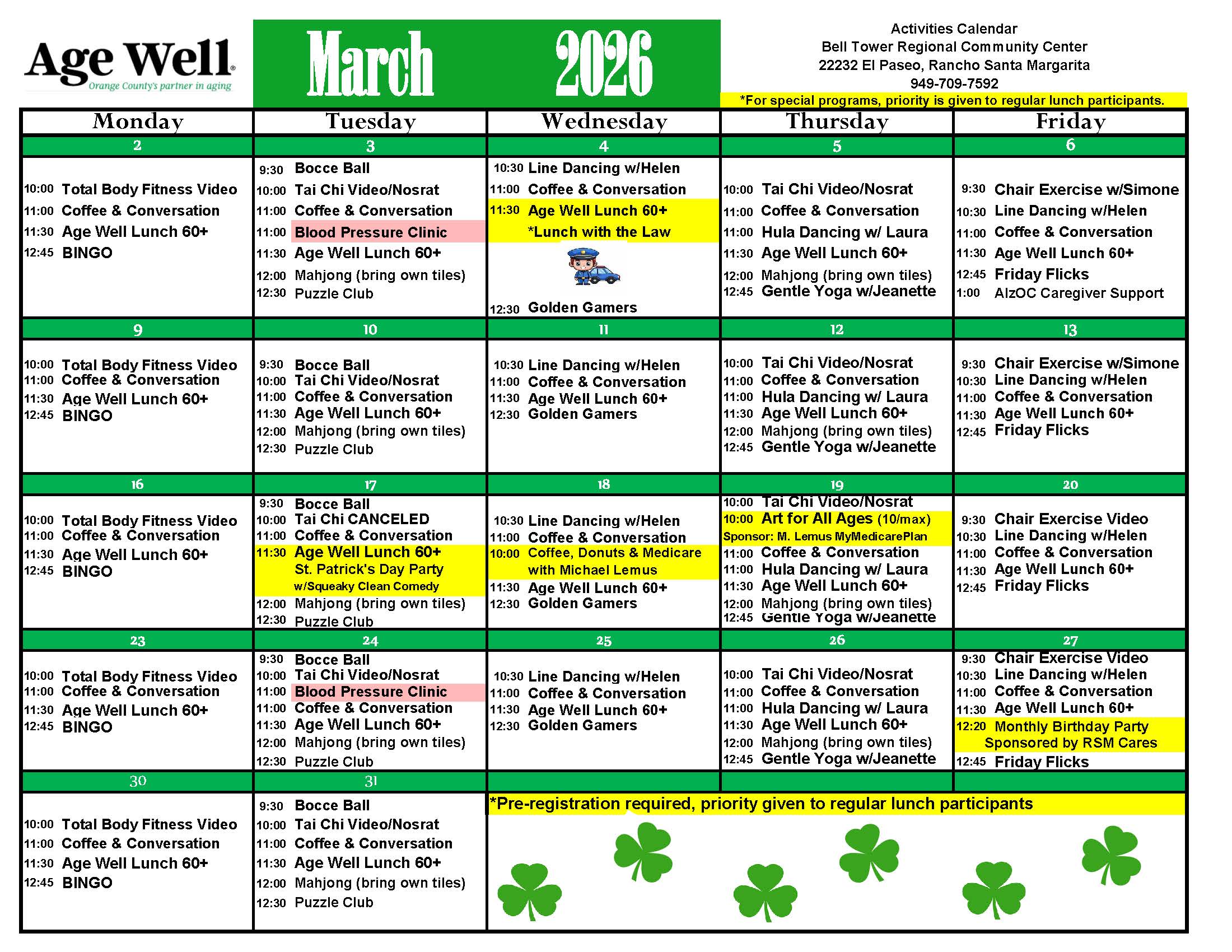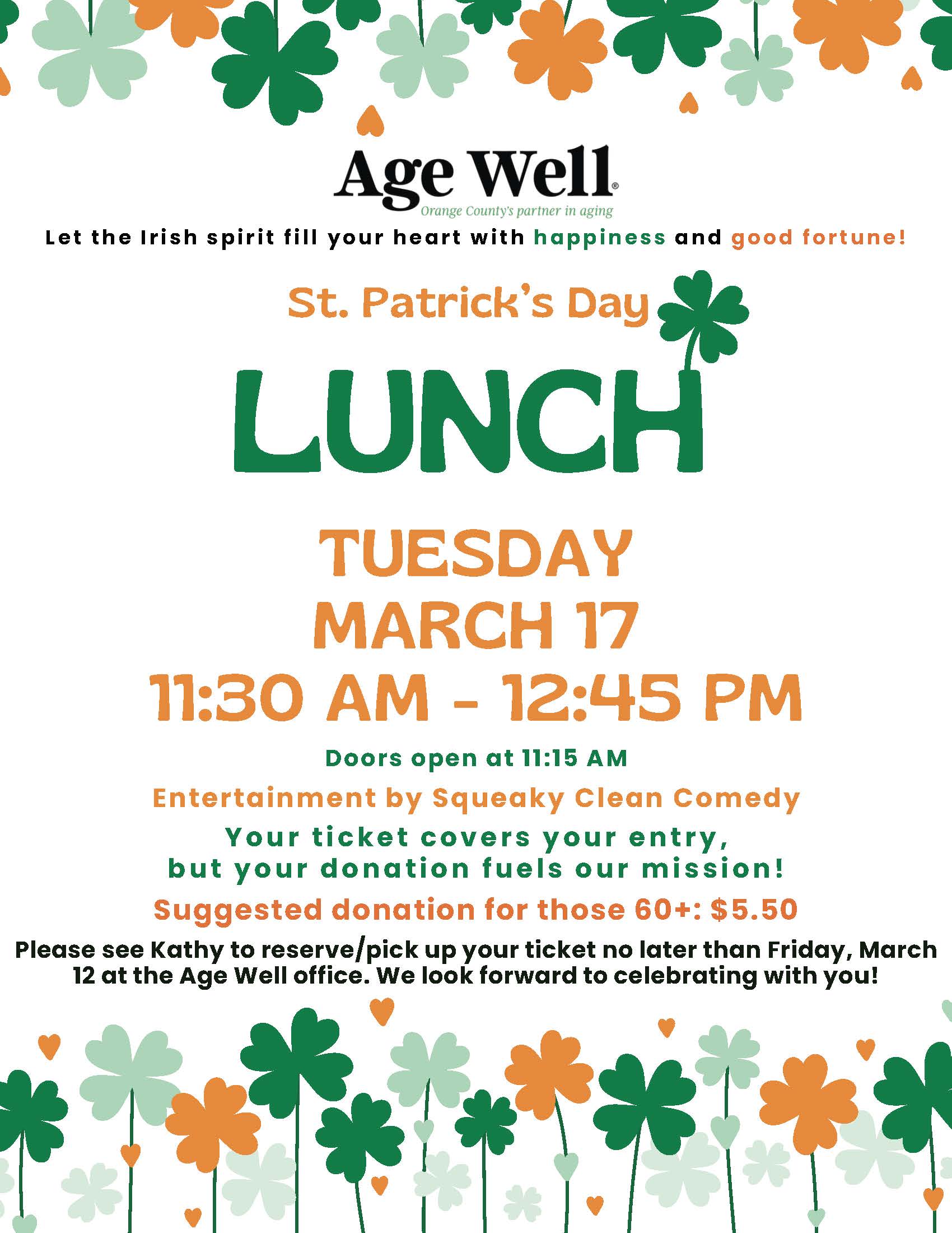 - RSVP: Reserve and pick up tickets at the Age Well office by Friday, March 12