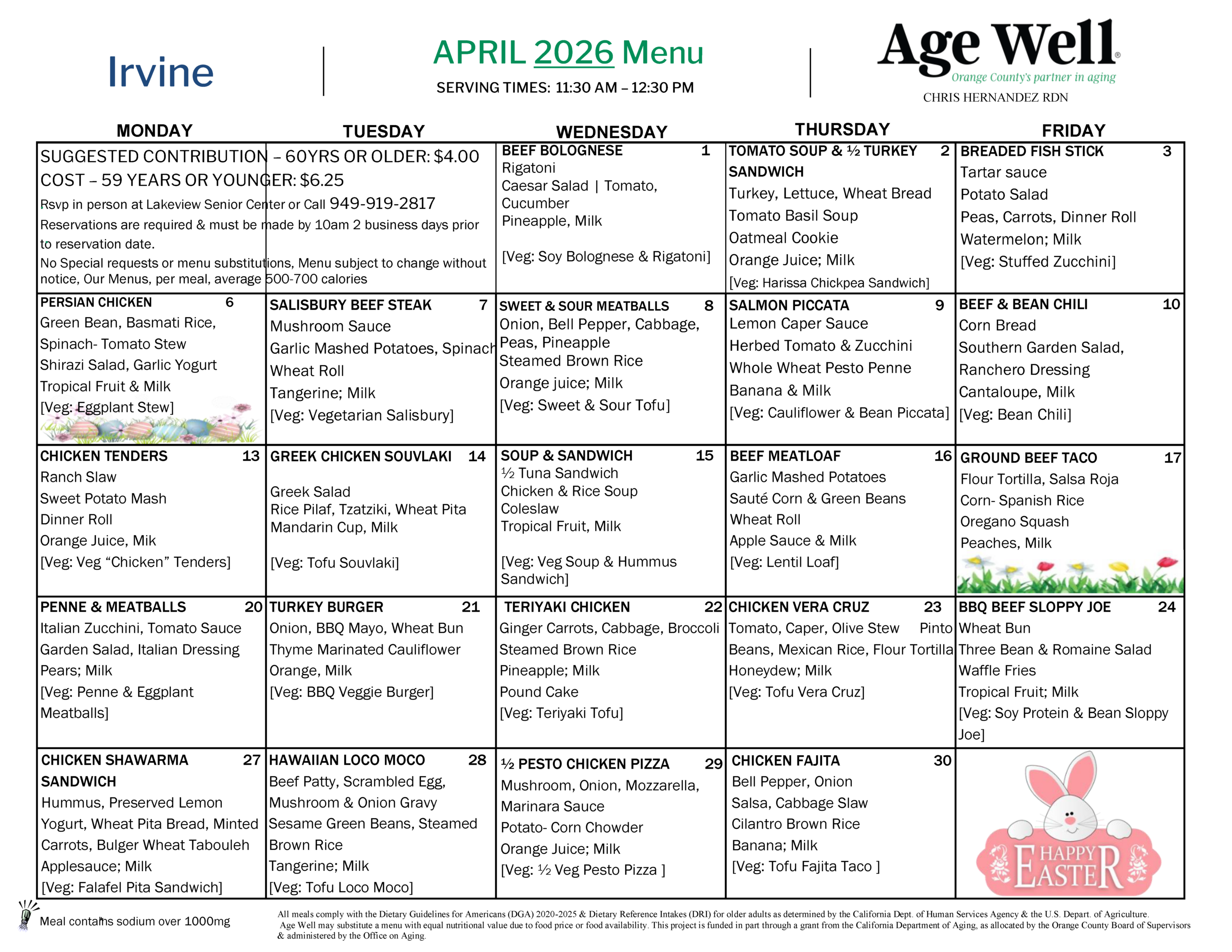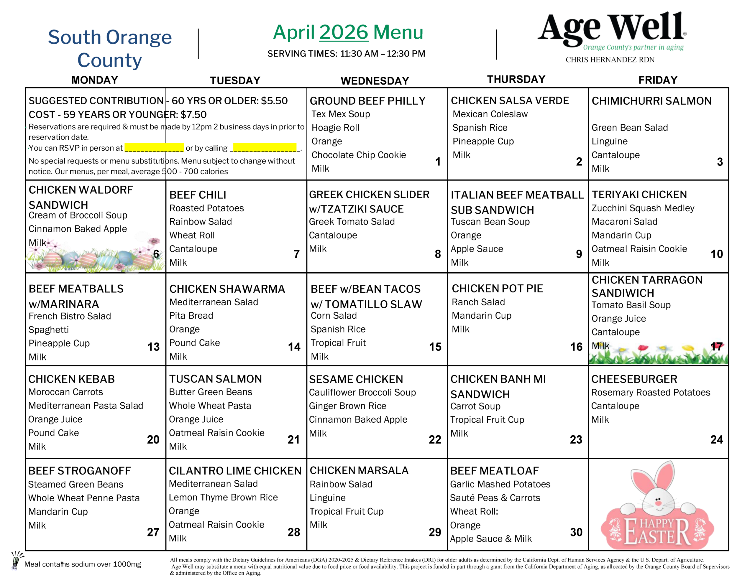 Join us for nutritious weekday lunches at Age Well Senior Centers in South Orange County and Irvine. With 10 participating locations to choose from, Age Well’s Lunch Café is a great place to connect with others and enjoy a healthy, affordable lunch. Meals are served fresh Monday through Friday and offer a great way to stay nourished and social.