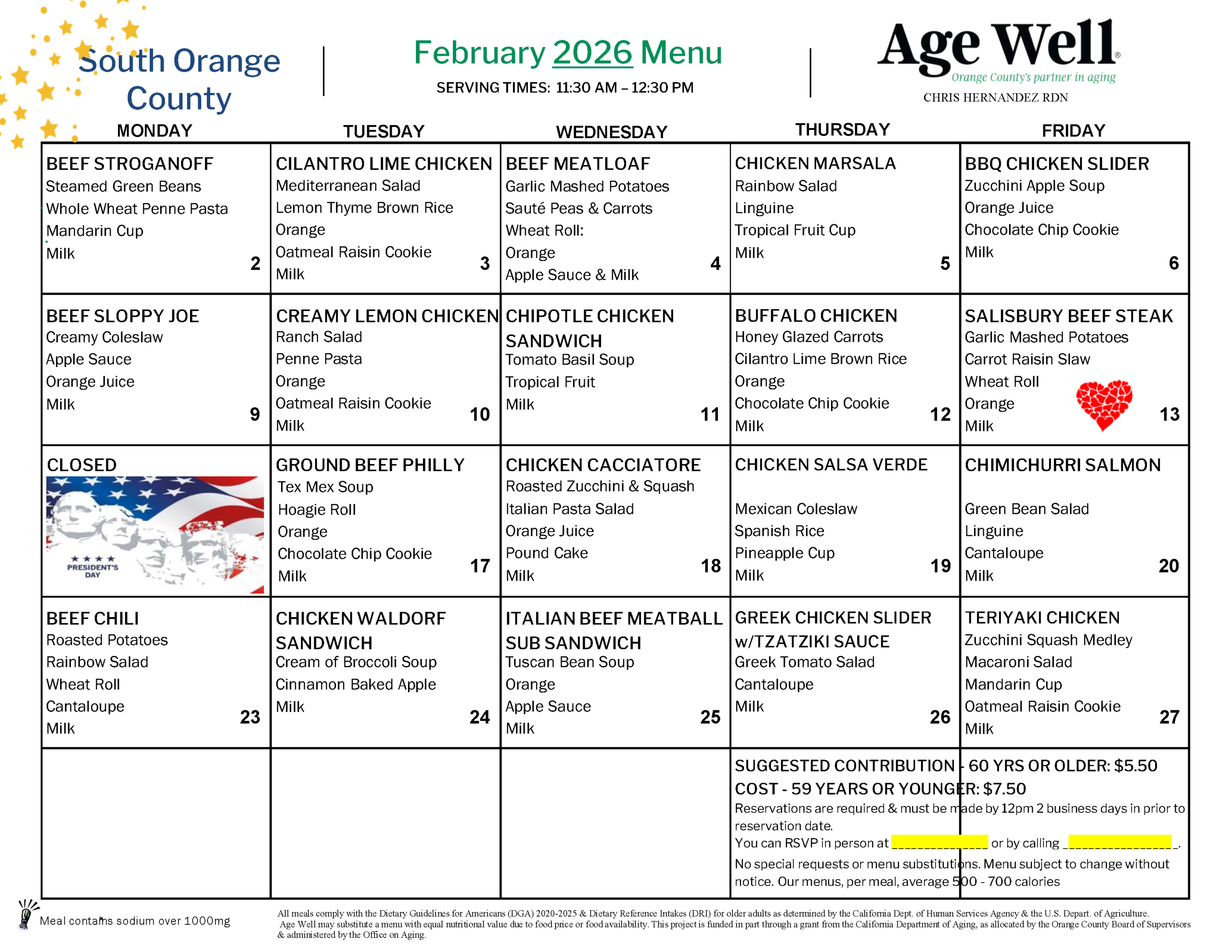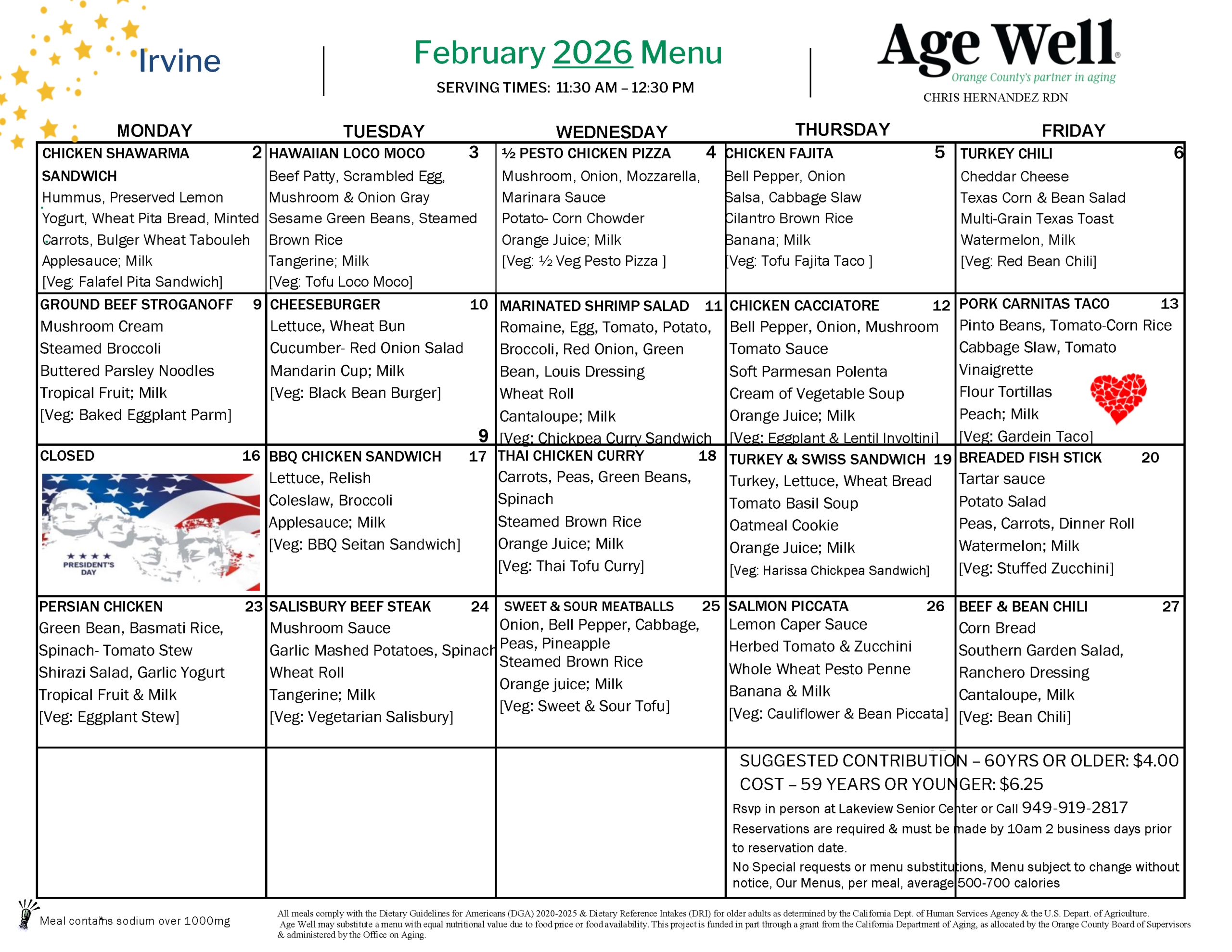 Join us for nutritious weekday lunches at Age Well Senior Centers in South Orange County and Irvine. With 10 participating locations to choose from, Age Well’s Lunch Café is a great place to connect with others and enjoy a healthy, affordable lunch. Meals are served fresh Monday through Friday and offer a great way to stay nourished and social.