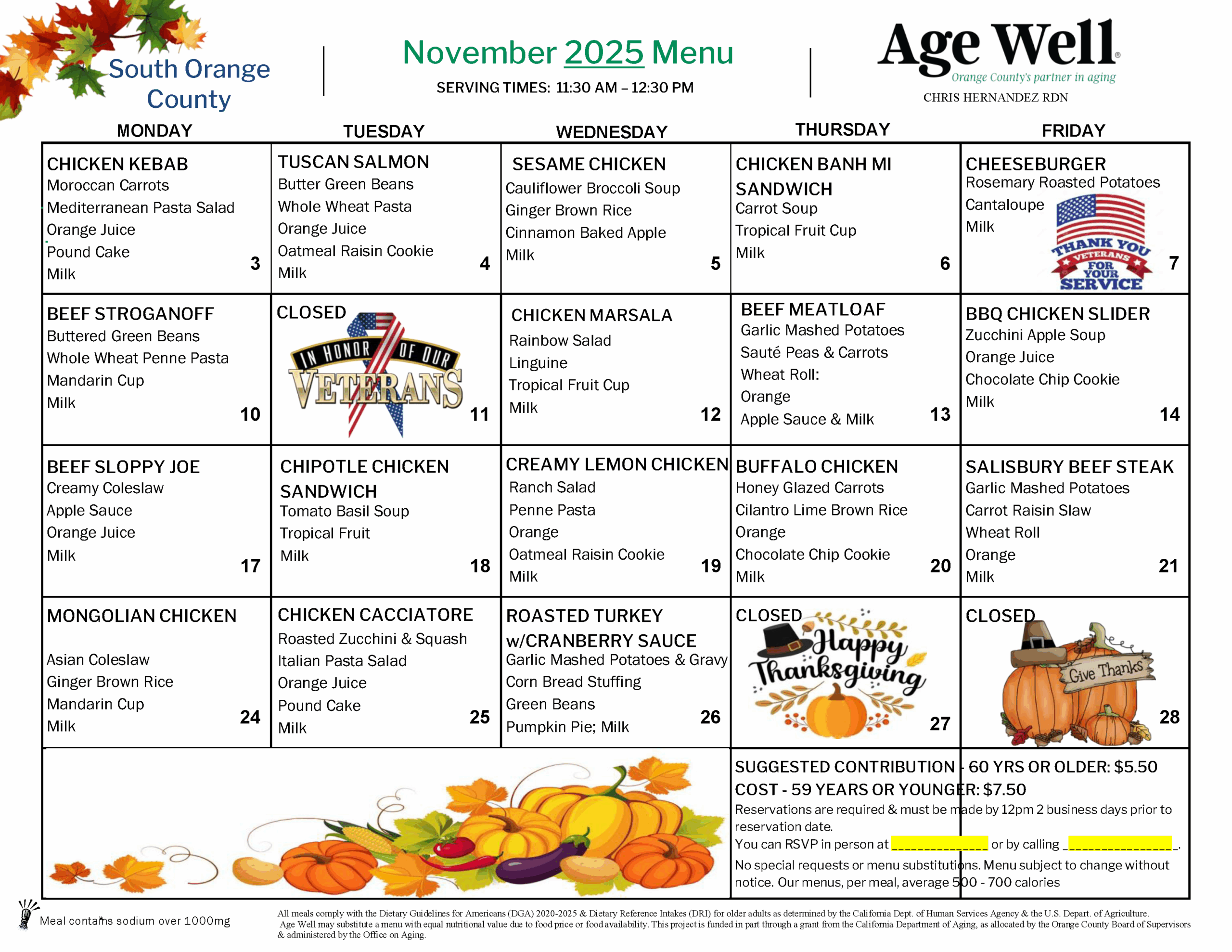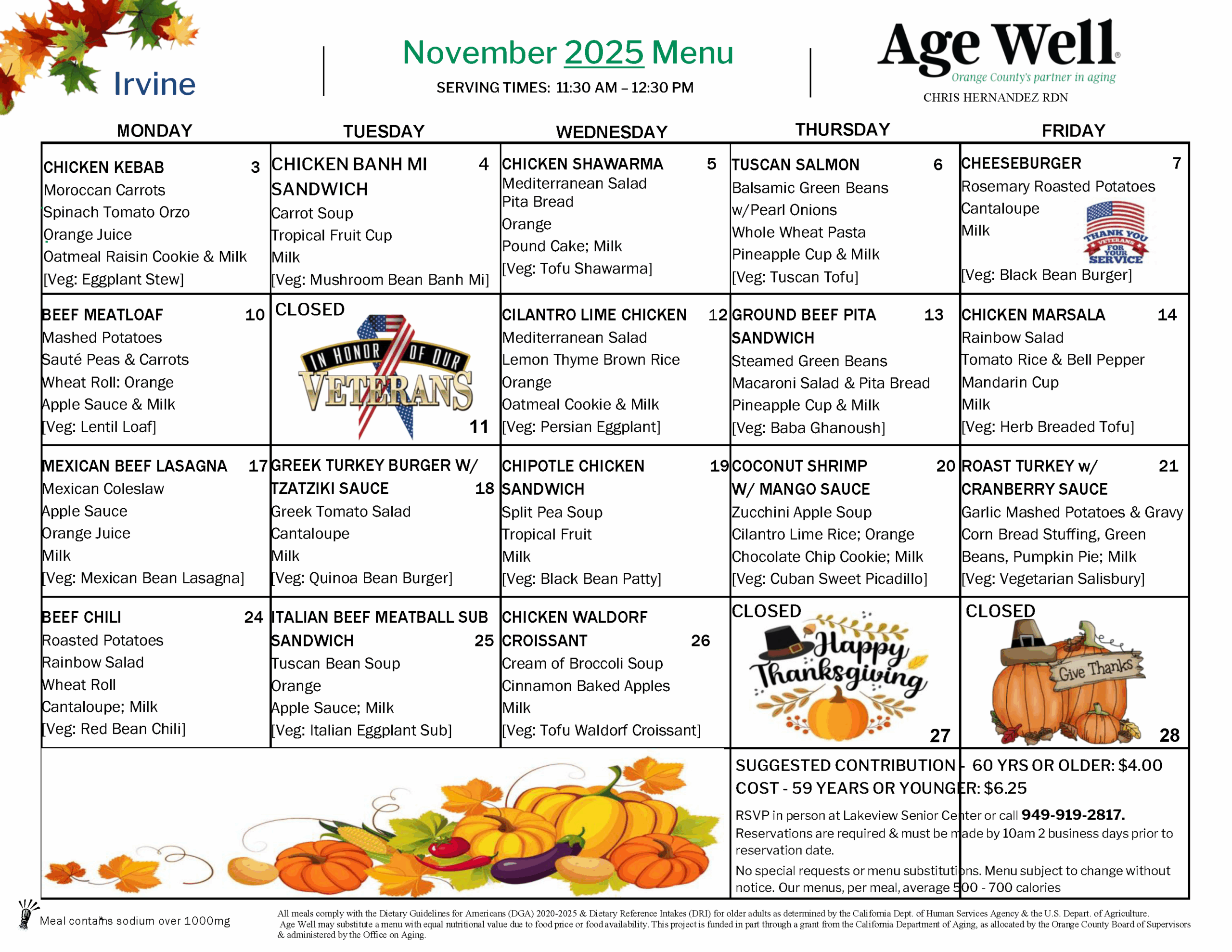 Join us for nutritious weekday lunches at Age Well Senior Centers in South Orange County and Irvine. With 10 participating locations to choose from, Age Well’s Lunch Café is a great place to connect with others and enjoy a healthy, affordable lunch. Meals are served fresh Monday through Friday and offer a great way to stay nourished and social.