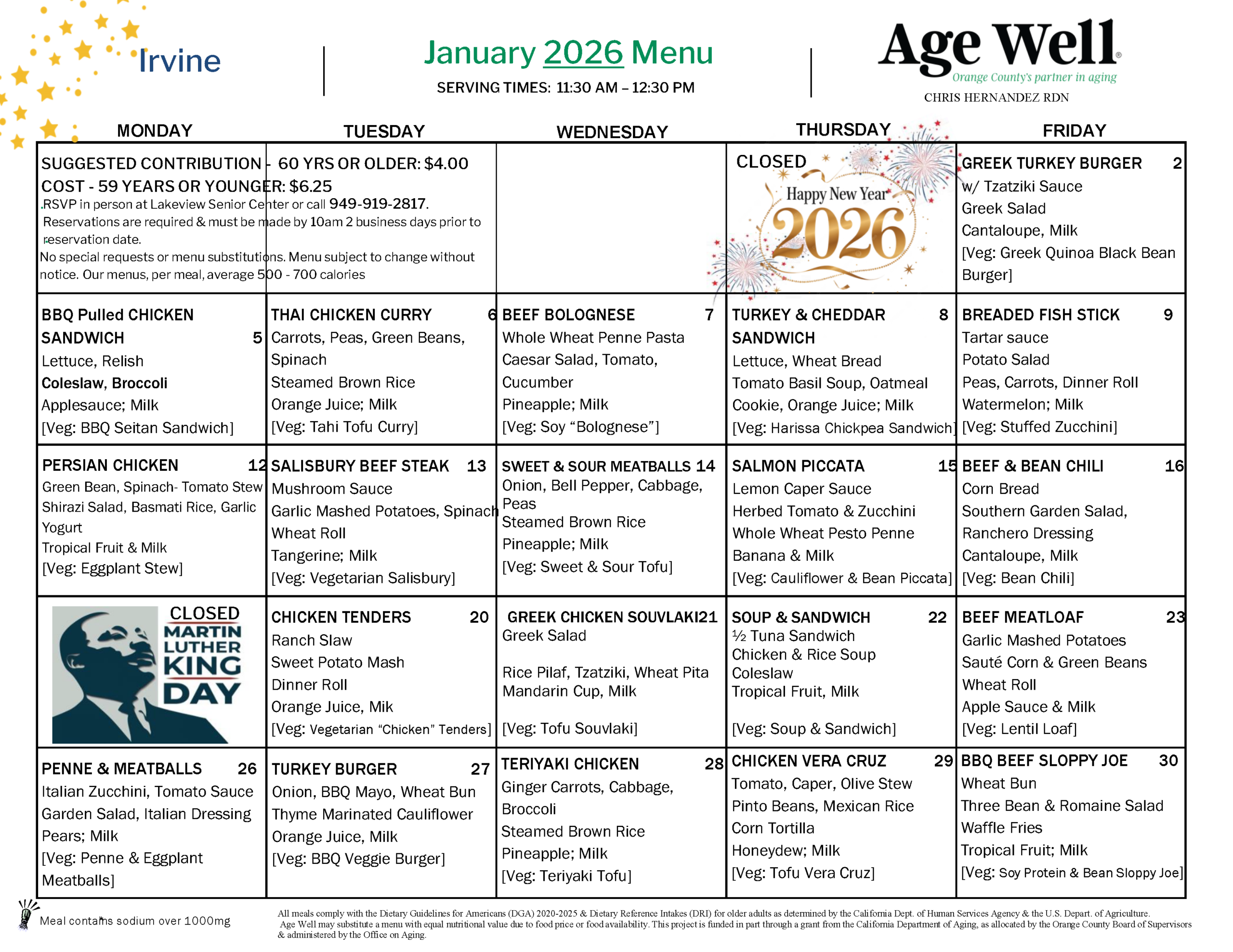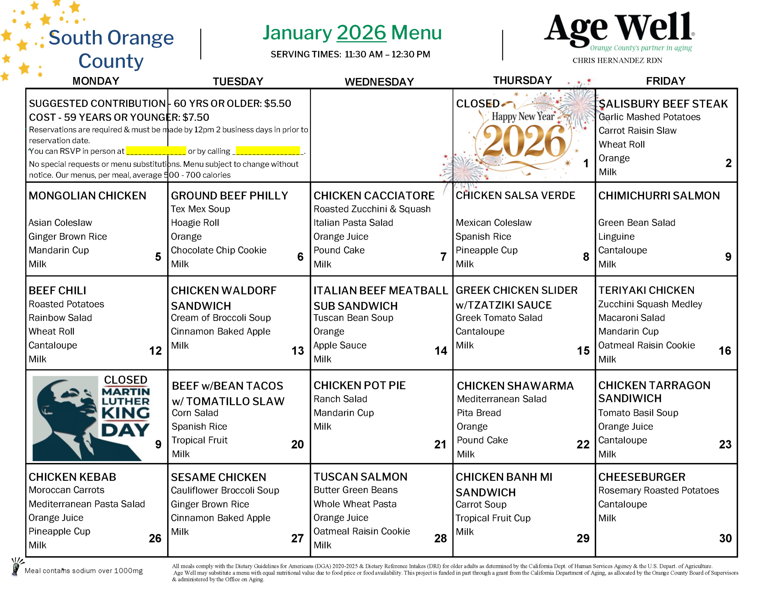 Join us for nutritious weekday lunches at Age Well Senior Centers in South Orange County and Irvine. With 10 participating locations to choose from, Age Well’s Lunch Café is a great place to connect with others and enjoy a healthy, affordable lunch. Meals are served fresh Monday through Friday and offer a great way to stay nourished and social.