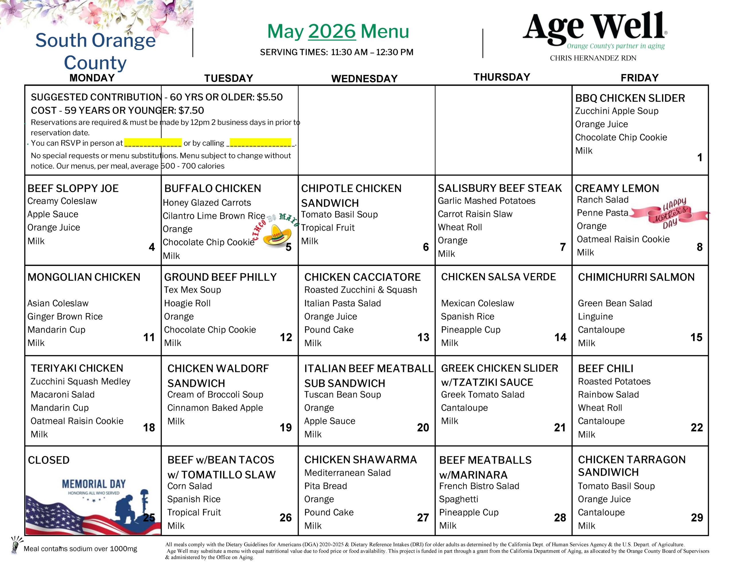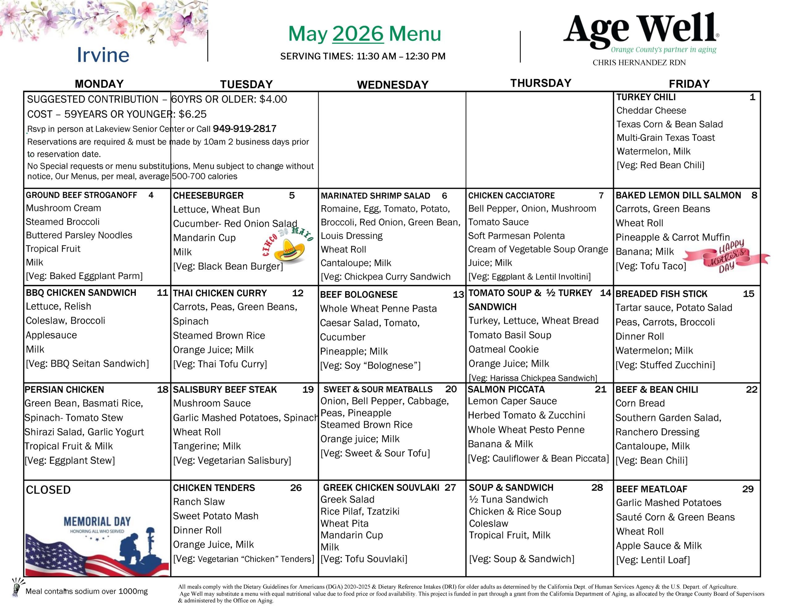 Join us for nutritious weekday lunches at Age Well Senior Centers in South Orange County and Irvine. With 10 participating locations to choose from, Age Well’s Lunch Café is a great place to connect with others and enjoy a healthy, affordable lunch. Meals are served fresh Monday through Friday and offer a great way to stay nourished and social.