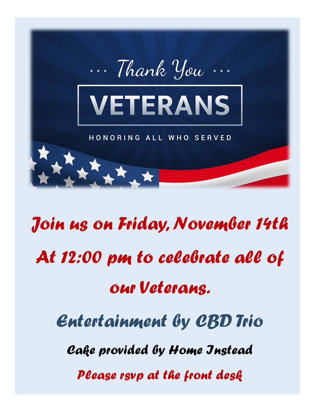 - Special Events: Veterans Day Lunch, Sound Bath with Optum, Blood Pressure Checks (Nov 25)